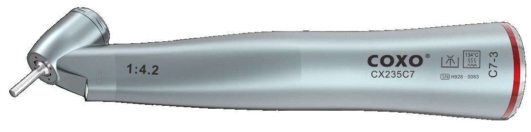 COXO CX235 C7-3 to chirurgiczna kątnica przyspieszająca, zaprojektowana do pracy w trudniej dostępnych obszarach. Przełożenie 1:4,2 pozwala osiągnąć wysoką prędkość, co sprawdza się podczas bardziej wymagających zabiegów. Nachylona pod kątem 45° główka ułatwia dostęp do zębów trzonowych i pracy w ograniczonej przestrzeni. Kątnica ma wbudowane światło oraz 4-punktowy system wodnego chłodzenia.